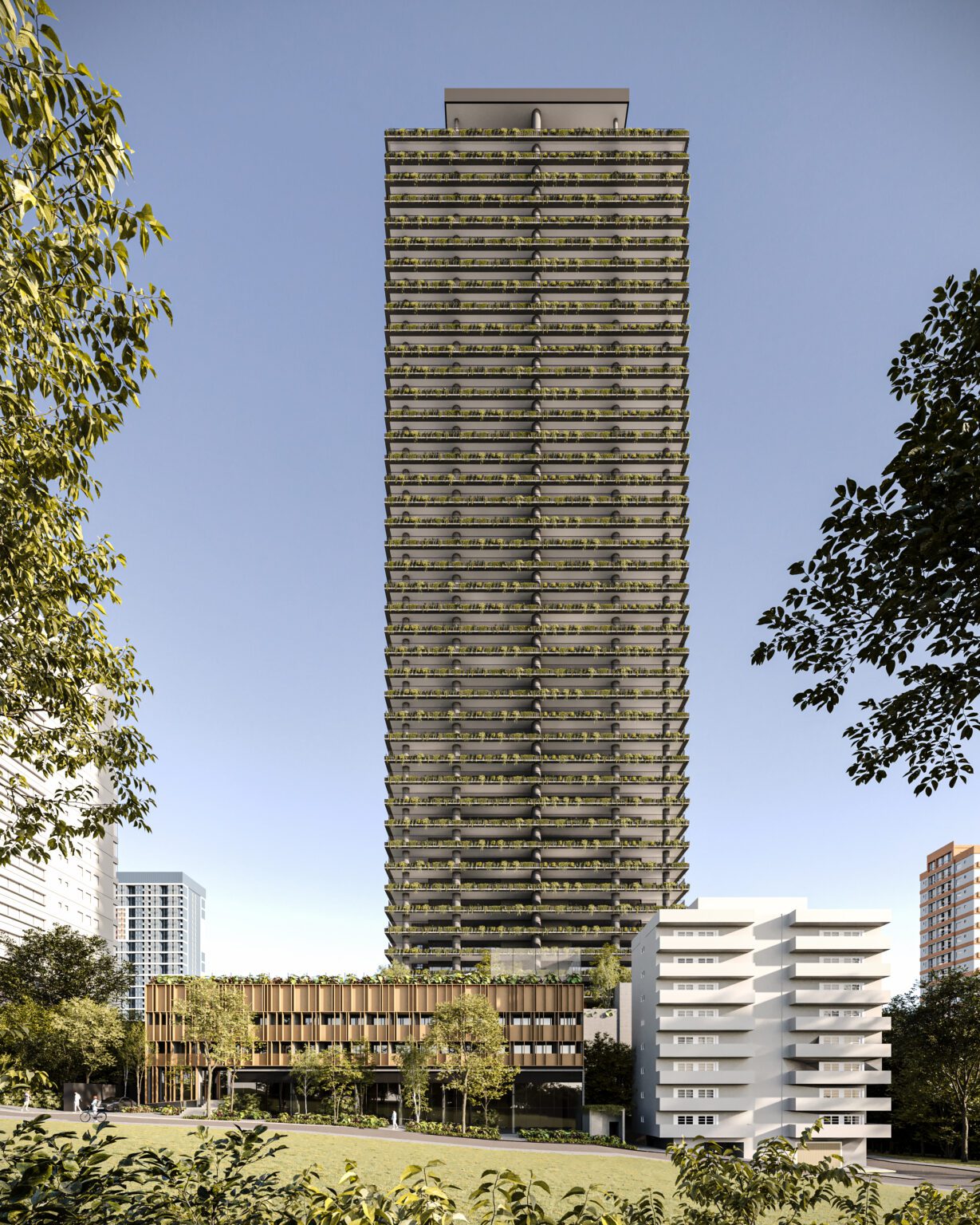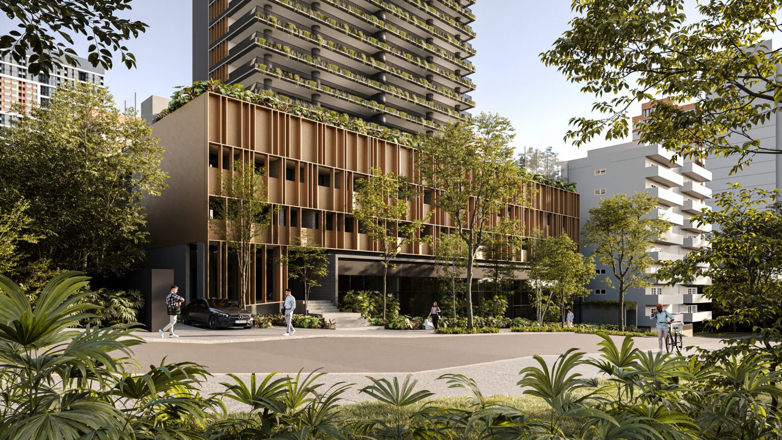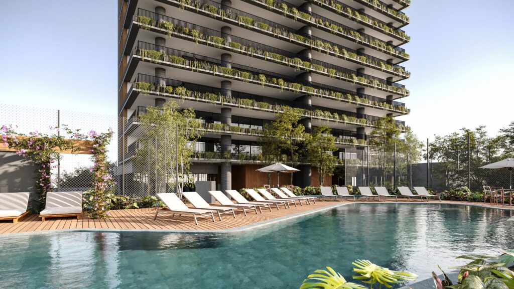 Para maior harmonia entre arquitetura e cidade, o embasamento do edifício abriga unidades compactas, salas comerciais e lojas voltadas para comércios já consolidados, preservando a dinâmica local. A volumetria robusta do embasamento contrasta com a torre residencial, que oferece vista privilegiada, privacidade e apartamentos amplos, iluminados e flexíveis.