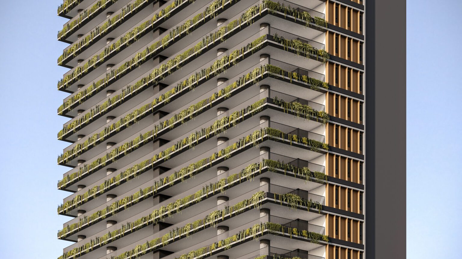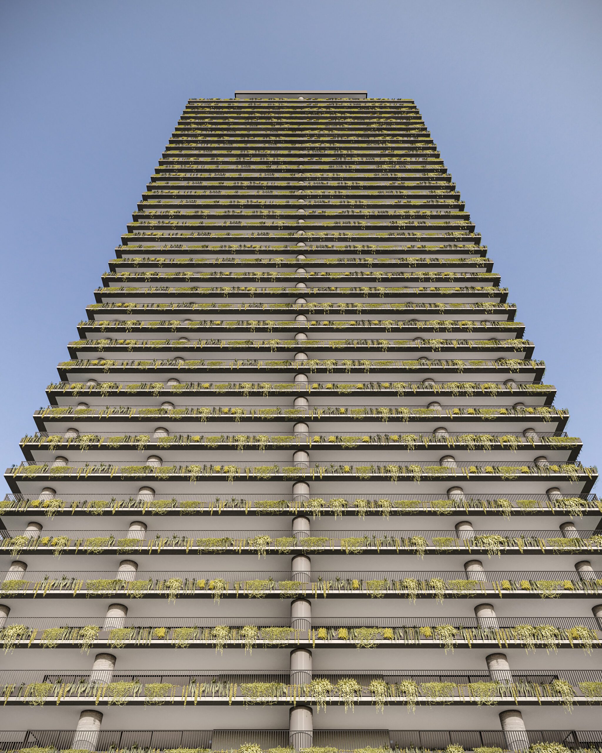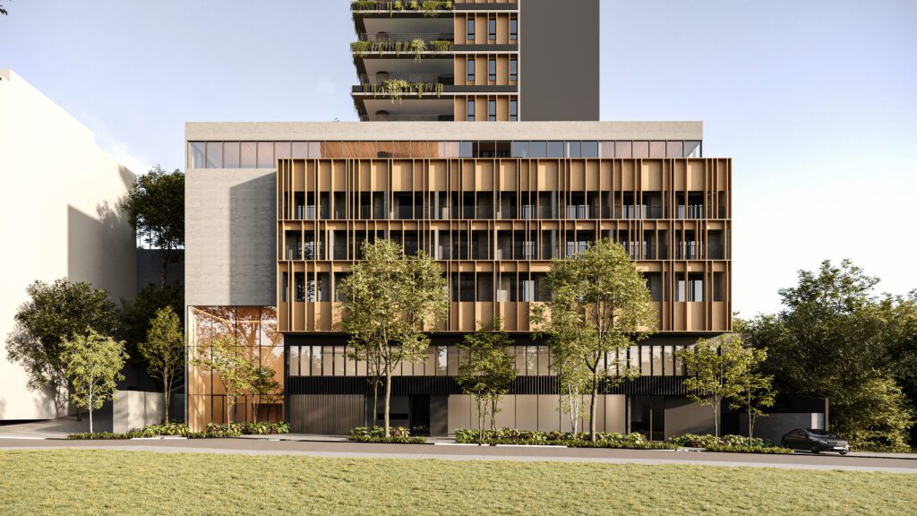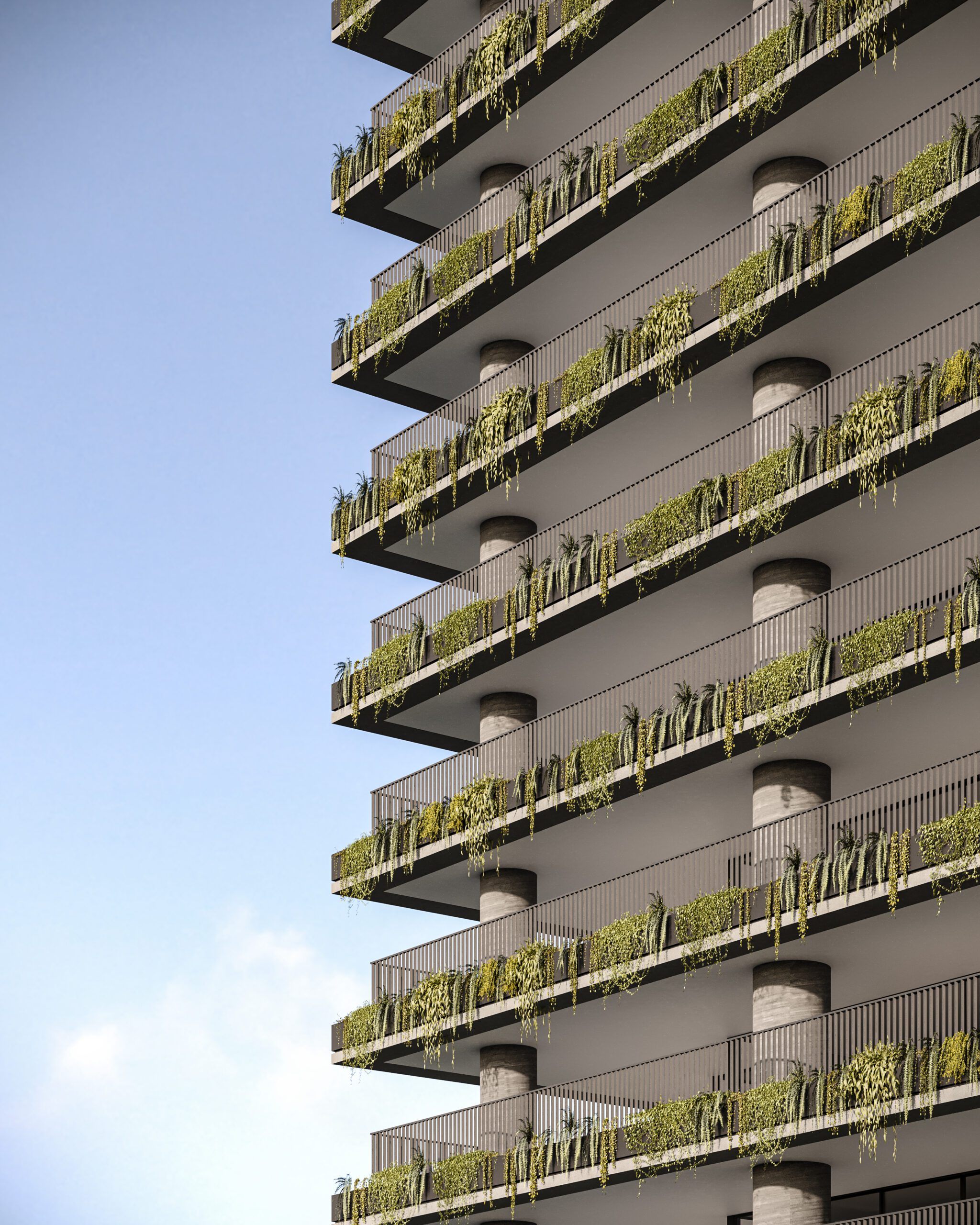 Para maior harmonia entre arquitetura e cidade, o embasamento do edifício abriga unidades compactas, salas comerciais e lojas voltadas para comércios já consolidados, preservando a dinâmica local. A volumetria robusta do embasamento contrasta com a torre residencial, que oferece vista privilegiada, privacidade e apartamentos amplos, iluminados e flexíveis.